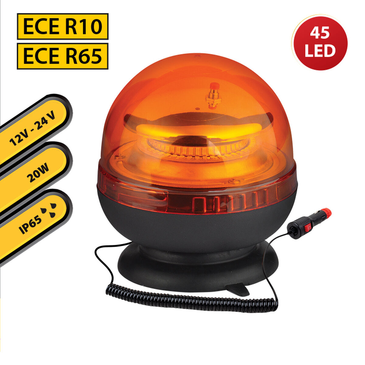 Die Stak Warnleuchte ist eine effiziente und robuste Lösung für die visuelle Signalgebung in industriellen, landwirtschaftlichen oder sicherheitsrelevanten Bereichen. Sie verfügt über eine hochintensive 20-W-LED-Leuchte, die optimale 360°-Sichtbarkeit bietet. Gefertigt aus hochfestem Kunststoff mit ABS-Basis und transparentem Polycarbonat-Diffusor, garantiert sie Schlagfestigkeit und eine lange Lebensdauer von bis zu 30.000 Stunden. Dieses Modell besitzt die E-Mark-Zulassung gemäß ECE R10 und R65, was Zuverlässigkeit und Qualität für den professionellen Einsatz an Fahrzeugen und technischen Maschinen bestätigt. Zwei integrierte Stroboskop-Blinkmodi sind speziell für Warnungen bei Notfällen oder Arbeiten in schlecht einsehbaren Bereichen konzipiert. Dank IP65-Schutz ist die Warnleuchte effektiv gegen Regen, Schnee und Nebel geschützt und gewährleistet auch unter schwierigen Bedingungen eine stabile Leistung. Das duale 12/24 V Stromversorgungssystem ermöglicht eine vielseitige Integration in verschiedenste Fahrzeuge, während der einfache Anschluss über den Zigarettenanzünder eine schnelle Installation und sofortige Nutzung ohne zusätzliche Adapter erlaubt. Das moderne Design vereint Funktionalität mit hoher Lichtausbeute und erfüllt die Anforderungen an Sicherheit und Signalgebung bei Gabelstaplern, landwirtschaftlichen Maschinen sowie technischen Fahrzeugen. Insgesamt ist die Stak LED-Warnleuchte darauf ausgelegt, starke Signalwirkung, Langlebigkeit und einfache Handhabung in professionellen Umgebungen zu bieten, in denen Sichtbarkeit und Sicherheit oberste Priorität haben.